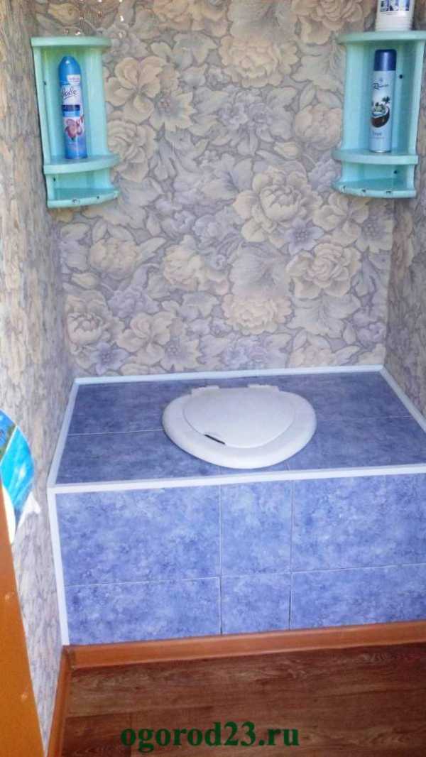 Внутри туалета обшиваем подиум и стены досками, деревянной или пластиковой вагонкой.