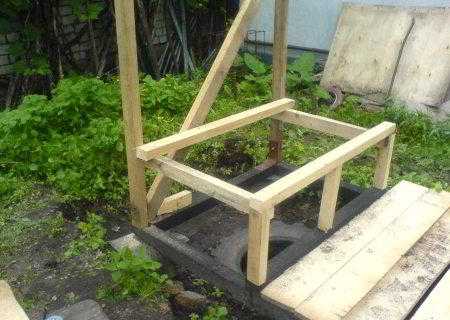 После этого над ямой воздвигают выбранную конструкции домика. Чаще всего в таких случаях устраивается деревянная конструкция.