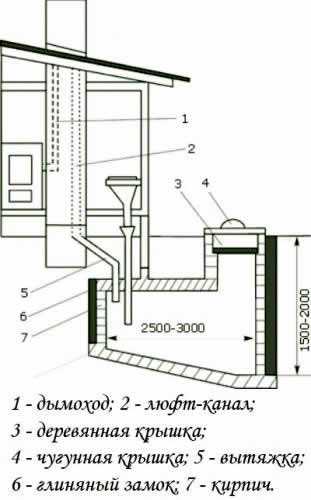 Верхняя часть ямы туалета закрывается двойной крышкой – между слоями чугуна и дерева устанавливается слой теплоизолятора. Самотек отходов может обеспечиваться наклоном трубы, которая ведет из унитаза в накопитель (в этом случае на этапе строительства необходимо предусмотреть для нее входное отверстие, а после ввода герметизировать шов) или конструкцией самого резервуара (расширяющаяся яма с заходом под дом по направлению от туалета на улицу с наклонным полом). Для люфт-клозета необходима вентиляция. В холодное время года эффективность вытяжки может обеспечиваться разностью температур, а в летнее время лучше использовать вытяжной вентилятор.