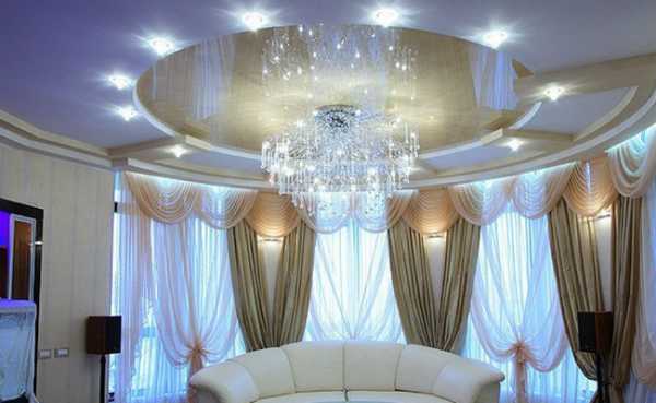 Для просторного зала актуальна многоуровневая отделка с натяжным полотном.