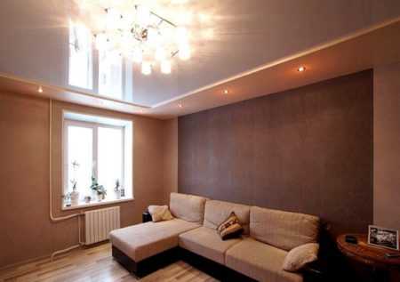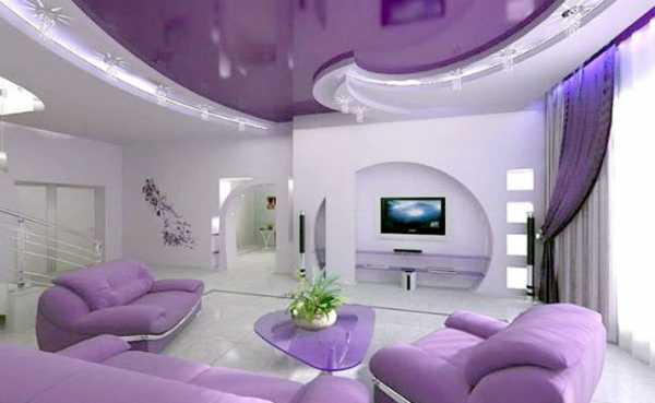 Многоуровневые конструкции натяжных или подвесных потолков позволяют создать интерьер зала с неповторимым дизайном. Малогабаритное пространство лучше не загромождать и украсить одноуровневой системой. Интересно оформить поверхность позволяет игра с цветовыми сочетаниями. Организация освещения на натяжных и подвесных потолках из гипсокартона должна проходить с учетом конструкции осветительного прибора, его веса и мощности ламп.
