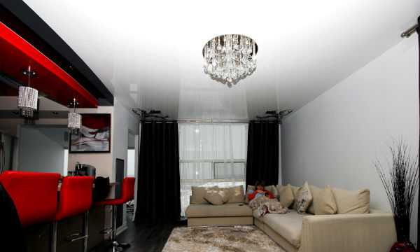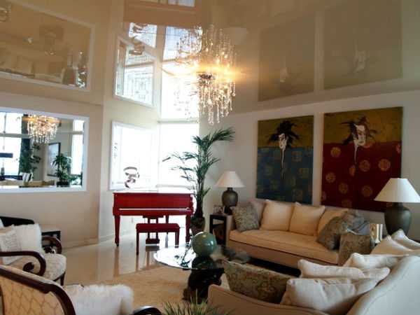 1. Глянцевый натяжной потолок благодаря своей зеркальности, даже небольшую комнату может визуально превратить в зал.