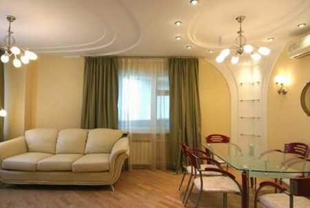 - Монтаж гипсокартонной конструкции в зале займет гораздо больше времени, нежели установка натяжного потолка. Процесс сопровождается большим образованием пыли и грязи. Но если владельцы жилья временно перебазировались на другую территорию, то проблема не страшна.