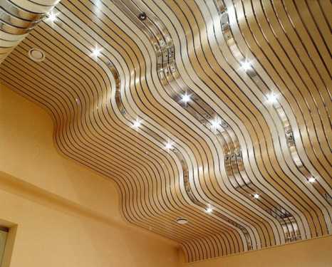 Красиво смотрятся волнообразные реечные потолки. Правда, для них потребуется не менее сорока сантиметров высоты стены и достаточно большая площадь. В противном случае потолок будет выглядеть слишком массивно и испортит интерьер.