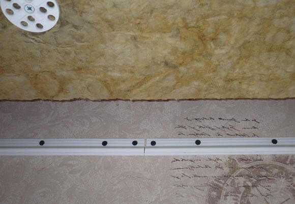 ΠΠ° ΡΠ»Π΅Π΄ΡΡΡΠ΅ΠΌ ΡΡΠ°ΠΏΠ΅ Π½Π° ΡΡΠ΅Π½Ρ Π½Π°Π½ΠΎΡΡΡ ΡΠ°Π·ΠΌΠ΅ΡΠΊΡ ΠΏΠΎΠ΄ ΠΏΡΠΎΡΠΈΠ»Ρ, ΠΊΡΠ΄Π° Π±ΡΠ΄Π΅Ρ Π·Π°ΠΏΡΠ°Π²Π»ΡΡΡΡΡ Π΄Π΅ΠΊΠΎΡΠ°ΡΠΈΠ²Π½ΠΎΠ΅ Π½Π°ΡΡΠΆΠ½ΠΎΠ΅ ΠΏΠΎΠ»ΠΎΡΠ½ΠΎ. ΠΠ»Π΅ΠΊΡΡΠΈΡΠ΅ΡΠΊΠΈΠΉ ΠΊΠ°Π±Π΅Π»Ρ ΠΏΠΎΠ΄ ΠΏΠΎΡΠΎΠ»ΠΊΠΎΠΌ ΠΏΠΎΠΌΠ΅ΡΠ°ΡΡ Π² Π·Π°ΡΠΈΡΠ½ΡΠ΅ Π³ΠΎΡΡΡ ΠΈ ΡΠΈΠΊΡΠΈΡΡΡΡ ΠΊ ΡΠ΅ΡΠ½ΠΎΠ²ΠΎΠΉ ΠΏΠΎΠ²Π΅ΡΡ Π½ΠΎΡΡΠΈ. ΠΠ΅ΡΠ΅Π΄ ΠΊΡΠ΅ΠΏΠ»Π΅Π½ΠΈΠ΅ΠΌ Π±Π°Π³Π΅Ρ Ρ ΠΎΠ±ΡΠ°ΡΠ½ΠΎΠΉ ΡΡΠΎΡΠΎΠ½Ρ ΠΏΡΠΎΡΠΈΠ»Ρ ΠΊΠ»Π΅ΡΡ ΡΠΏΠ»ΠΎΡΠ½ΠΈΡΠ΅Π»ΡΠ½ΡΡ Π»Π΅Π½ΡΡ, ΠΊΠΎΡΠΎΡΠ°Ρ Π΄ΠΎΠΏΠΎΠ»Π½ΠΈΡΠ΅Π»ΡΠ½ΠΎ ΠΈΠ·ΠΎΠ»ΠΈΡΡΠ΅Ρ Π·Π²ΡΠΊ. ΠΡΠ»ΠΈ ΡΠΊΠ»Π°Π΄ΠΊΠ° ΡΡΠΌΠΎΠΈΠ·ΠΎΠ»ΡΡΠΈΠΈ ΠΏΡΠΎΠ²ΠΎΠ΄ΠΈΡΡΡ ΠΊΠ°ΡΠΊΠ°ΡΠ½ΡΠΌ ΠΌΠ΅ΡΠΎΠ΄ΠΎΠΌ, ΠΏΠΎΠ΄ ΠΏΠΎΡΠΎΠ»ΠΊΠΎΠΌ ΡΠΎΠΎΡΡΠΆΠ°ΡΡ ΠΊΠ°ΡΠΊΠ°Ρ ΠΈΠ· Π΄Π΅ΡΠ΅Π²ΡΠ½Π½ΡΡ Π±ΡΡΡΡΠ΅Π².