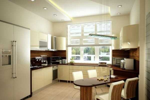 - Потолок в маленькой кухне лучше сделать двухуровневым симметричным: короб по периметру, например, или центральная фигура второго уровня. Или даже потолочная ниша.