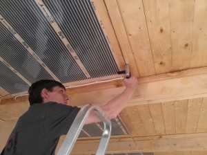Это годный вариант для дачи. Потолочные пленочные обогреватели монтируются под покрытие, снаружи не видны. Для изоляции с чердака применяйте ПЕНОФОЛ либо схожий по свойствам материал. Производитель выпускает самоклеющуюся разновидность, которая берется на дерево и бетон. Обратная сторона – типичный полиэтилен. Не забудьте дерево обработать грунтом для гидроизоляции и антисептиком, для бетона выполняется лишь первый шаг. Действие убережет ПЕНОФОЛ от отслаивания в процессе эксплуатации. Пленочные обогреватели наподобие ПЛЭН допускается поклеить к полиэтиленовой теплоизоляции. Сгодится любой состав, берущий синтетику.
