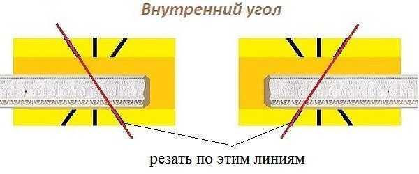 Направление резки потолочного плинтуса для внешних и внутренних углов