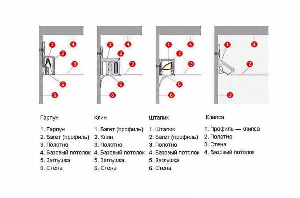 Установить натяжной потолок правильно — это значит, должным образом закрепить его в багетах. Существует два вида крепежа, отличающихся друг от друга различными конструктивными подходами. Кроме того, вариант крепления зависит от материала, из которого изготовлено полотно.