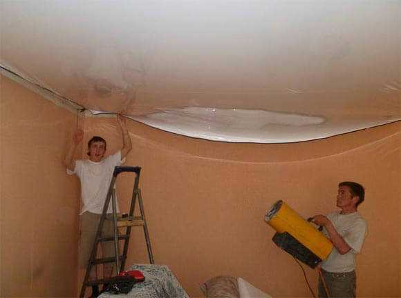 - При установке потолка из ПВХ-пленки необходимо довести температуру помещения до 40–45 градусов. Рекомендуется перекрыть все возможные источники прохладного воздуха – окна, двери, вентиляционные решетки. Сквозняк и охлажденный воздух могут механически повредить мембрану, создавая на ней неровности, которые повлияют на свойства полотнища и усложнят процесс установки. Монтаж можно начинать, когда пленка будет равномерно гибкой и без заломов. Глубокие складки на пленке можно обработать тепловой пушкой или феном.