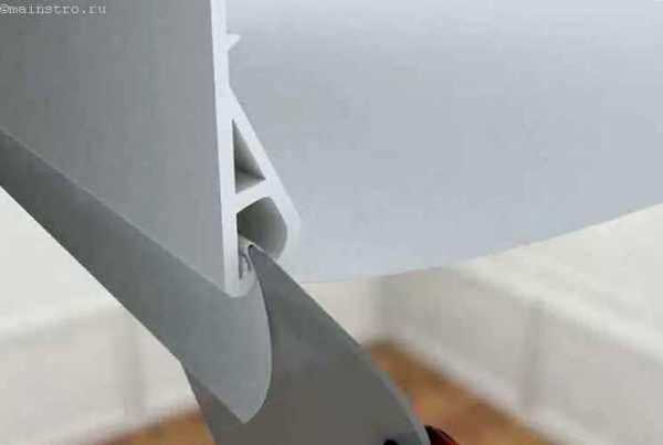 - Необходимо прикрепить профиль ко всем наружным и внутренним углам помещения с шагом 8–12 см между креплениями. Все острые углы должны быть сглажены напильником, чтобы предотвратить проколы и порезы полотнища.