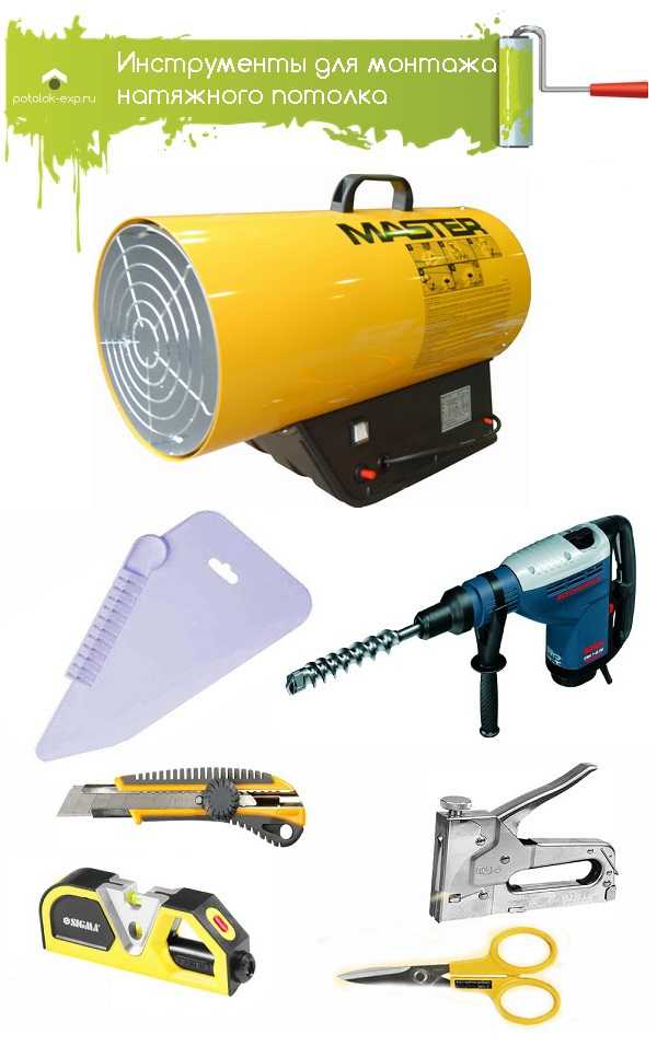 - Воздухонагреватель (только для ПВХ-потолка) – специалисты, занимающиеся установкой потолка, привозят тепловую пушку и газовый баллон для ее работы. При самостоятельной установке потолка можно использовать комнатный обогреватель для нагрева помещения и горячий фен для разглаживания складок на полотне.