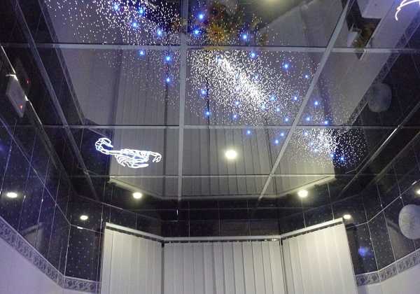 Зеркальное потолочное покрытие может быть настоящим и имитирующим. Первое создается из обычных зеркал, а второе – из отражающих панелей. Такой потолок не нуждается в описании, ведь не трудно себе представить единое полотно или мозаику.