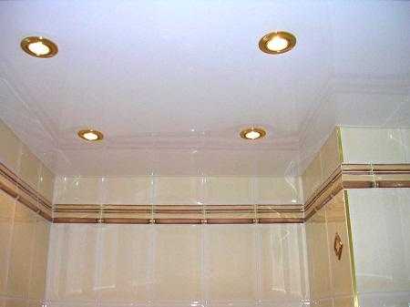 В ванной комнате хорошо смотрится потолок из ПВХ в сочетании с точечными светильниками