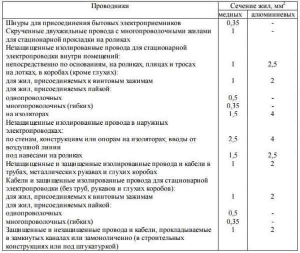 Это мы предоставили основные требования к соединениям электропроводки в жилых и производственных помещениях. Рекомендуем ознакомиться с таблицей, в которой указаны минимальные сечения жил для электромонтажных работ (п. 2.1.14 ПУЭ):