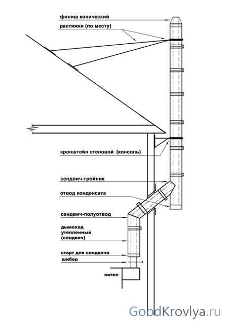 - при необходимости, надеваем специальный кронштейн, а затем закрепляем дымоотводную трубу растяжками.