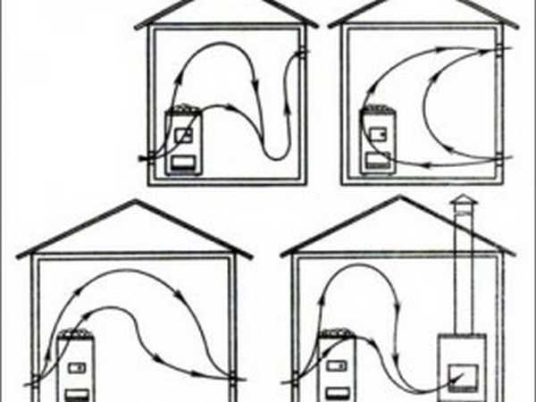 Оба отверстия располагаются на одной стене, противоположной от печи. Входное отверстие располагается в 20-30 см от пола, а выходное – на таком же расстоянии от потолка. На вытяжное отверстие, как и в первом варианте, устанавливается вентилятор. Воздух нагревается после соприкосновения с каменкой, после чего цикл повторяется.