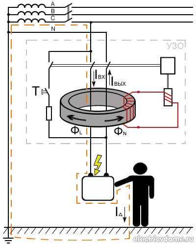 Принцип работы устройства защитного отключения основан на сравнивании величины тока на входе и выходе защищаемого объекта.