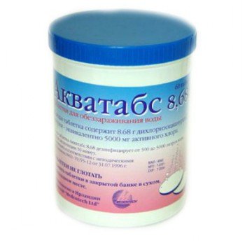 Назначение: Таблетки Акватабс предназначены для обеззараживания питьевой воды при нецентрализованном водоснабжении, емкостей для хранения воды, для обеззараживания в плавательных бассейнах (воды, объектов в помещениях ванны бассейна, раздевальнях, душевых, санузлах, санитарно-технического оборудования, уборочного материала), а также для обеззараживания фруктов, овощей и воды для приготовления пищевого льда. Для обеззараживания мутной и воды с высокой цветностью рекомендуется ее предварительная фильтрация через мелкотканевый фильтр.