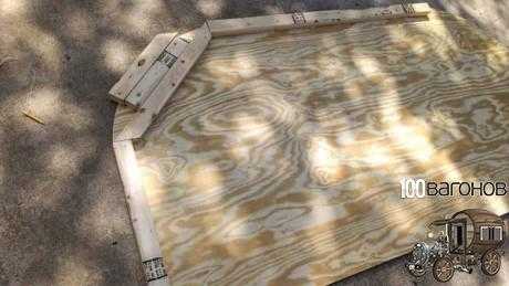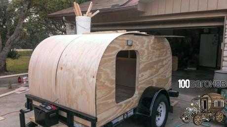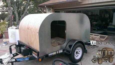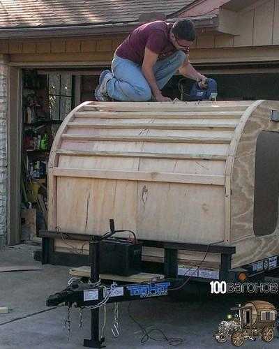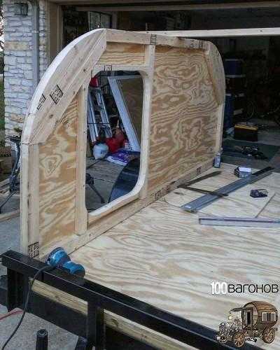 Тем временем прицеп дача создаваемая своими руками потихонечку начала приобретать свой облик. Балки скрепили между собой правую и левую часть, а изнутри к ним прикреплялась более тонкая и гибкая фанера.