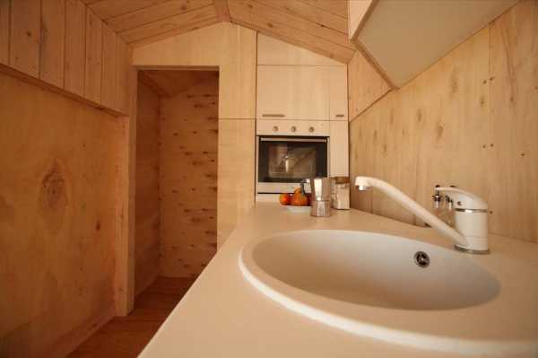 Этот мобильный домик с виду напоминает избушки из детских рисунков – треугольник, прямоугольник и труба. Тут есть все нужное: кровать, туалет, ванная, печь, стол. При отсутствии доступа к сетям, электричество поступает от ясных батарей.