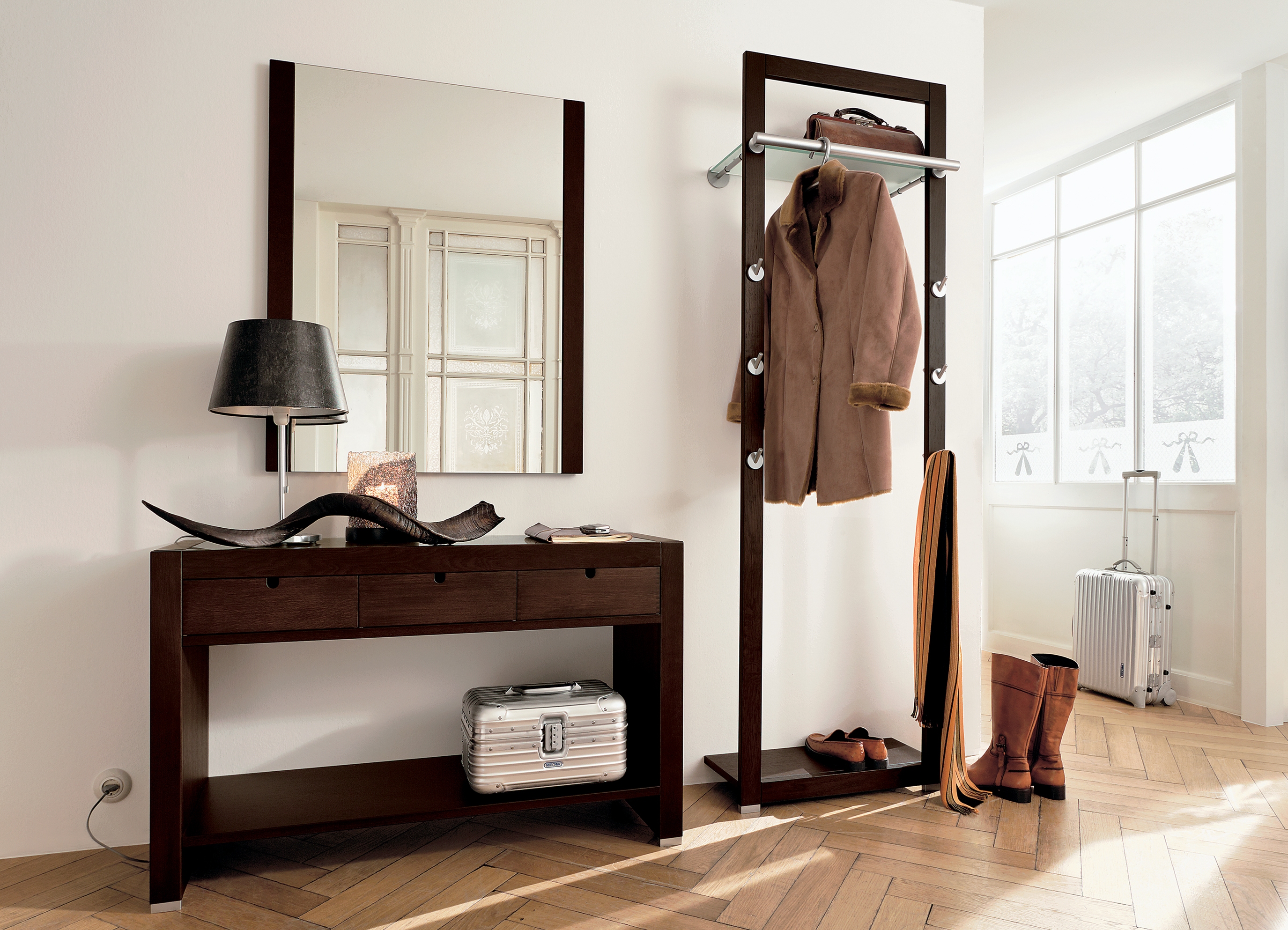 В классической прихожей также должна быть открытая вешалка. Верхнюю одежду после улицы, особенно в дождливое время года, нельзя вешать в закрытый шкаф. Шуба или пальто должны высохнуть естественным способом, поэтому и нужна такая вешалка. Пусть даже узкая, с двумя крючками, но главное, чтобы была. В модульных и корпусных прихожих вешалка часто совмещается с обувницей или тумбой. А если крючки разместить друг от друга на большом расстоянии, между ними поместится зеркало.