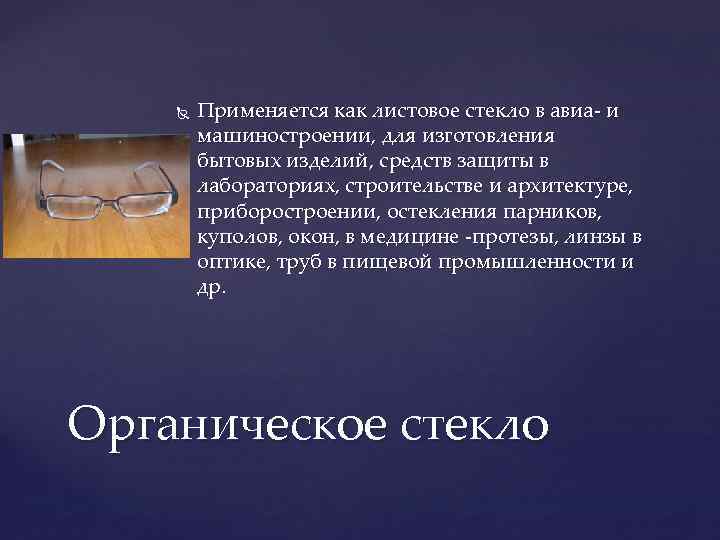 На данный момент стекло широко применяют в строительной сфере, в оптической промышленности, медицине, машиностроении, приборостроении, интерьере, современной архитектуре, электротехнике и в быту.