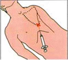 Анестезия кожи выполняется шприцем №1на уровне нижележащего ребра, затем игла проводится по верхнему его краю с одновременной анестезией тканей. К пункционной игле подсоединяется через переходник шприц №2, заполненный на 1/3 новокаином.