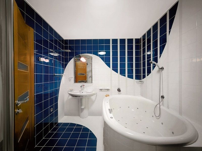 Морская атмосфера всегда подходит для ванной комнаты и может быть достигнута с помощью современных штрихов. Используйте светло-голубые плитки, изогнутые под углом, как волны, с темно-синими акцентами по всему пространству. Выбирайте состаренные деревянные полы, имитирующие дно лодки, а круглое зеркало в блестящей золотой раме может выглядеть как иллюминатор.