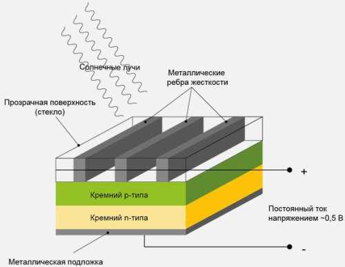 Конструкция стандартных солнечных батарей следующая. Фотоэлектропреобразователь состоит из 2 слоев n и p типа. n-слой изготавливают на основе кремния и фосфора, что приводит к избытку электронов. p-слой делают из кремния и бора, в результате чего образуется избыток положительных зарядов («дыр»). Слои помещают между электродов в таком порядке: