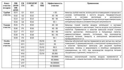 Таблица классификации фильтров в зависимости от класса осуществляемой очистки (+)