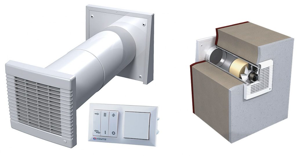 Его требуется размещать с северной стороны, поскольку по статистике отсюда ветер дует чаще всего. На входе воздуха в клапан стоит вентилятор, который разряжает поток, загоняя приходящий воздух в канал. Этот канал может состоять из ответвлений, которые идут к нужным помещениям в доме. Связывает их коллектор — распределительный отсек. - На выходе стоит смеситель. Это специальная камера, которая ставится в каждой комнате. Она выводит потоки свежего воздуха в помещение. Здесь стоит рекуператор — устройство, которое служит для нагрева воздуха до комфортной температуры. Нагрев идет без существенных затрат, поскольку по факту осуществляется обычный обмен энергией, между отработанным горячим углекислым газом из помещения и уличным, охлажденным воздухом. В летнее время рекомендовано ставить кондиционеры, чтобы охлаждать горячий поток, приходящий с улицы.