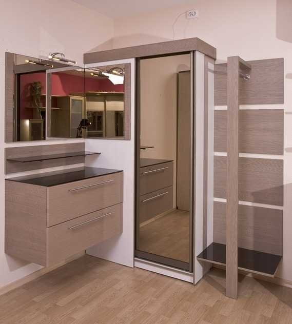 - Шкаф для установки в угол с глубиной до 60-70 см, с зеркалом, размещенным на дверце или в виде компактного отдельностоящего предмета.