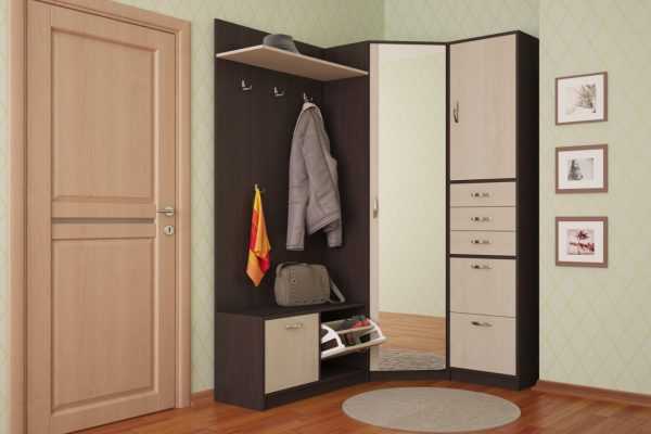 Модульная прихожая: угловой шкаф можно дополнить самостоятельно подобранными тумбочками и стеллажами. Найдите в интернете фото уже готовых модулей, это облегчит выбор Дополнительные элементы приобретаются отдельно или изготавливаются на заказ. Этот вариант применим даже для маленьких помещений. Большим плюсом является возможность максимального удовлетворения потребностей и вкусовых предпочтений.