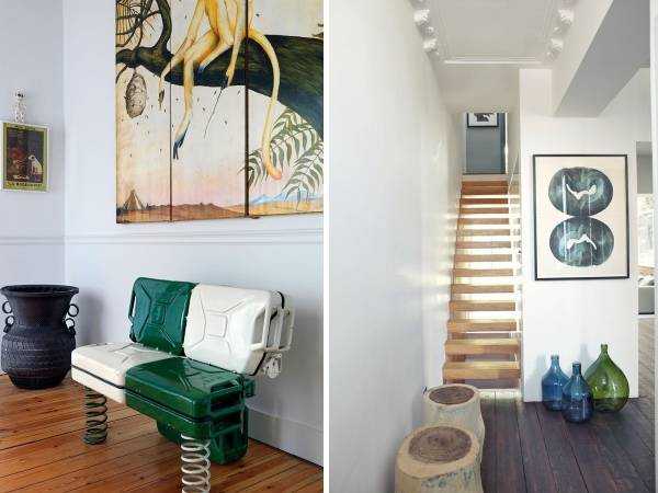 Кирпичные, бетонные и другие «сырые» стены являются визитной карточной интерьеров в стиле лофт. Учитывая, что данный стиль зародился на старых заброшенных фабриках и складах, то идеальным дополнением к нему являются промышленные светильники, старые ящики, трубы и другие детали в стиле индастриал. Но не стоит забывать, что первые лофты были убежищем поэтов, художников и других представителей богемы, и они придали лофтам шарм с использованием ярких тканей, картин, скульптур и других предметов декора. Прихожие в стиле лофт на фото: