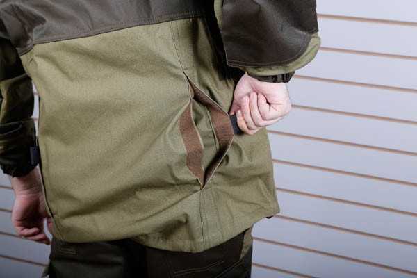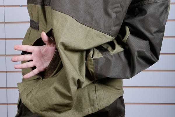 Рукава с манжетами. Хотя, не хватает внутренних манжет из резинки или неопрена. Было бы прикольнее, опять же дополнительная защита от клеща и комарья, дождик бы с рук не протекал в рукав. Но нет — так нет. Приделаем сами.