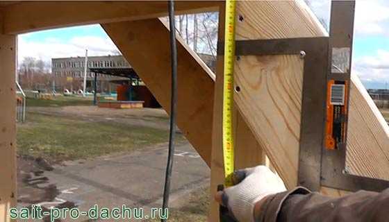 Когда каркас готов уже несложно прибить к нему две направляющие и при помощи пары угольников очертить на них контуры ступеней. Кстати, чтобы рассчитать их высоту необходимо имеющуюся величину горки разделить на планируемое количество досочек. У меня получилось 22 сантиметра.