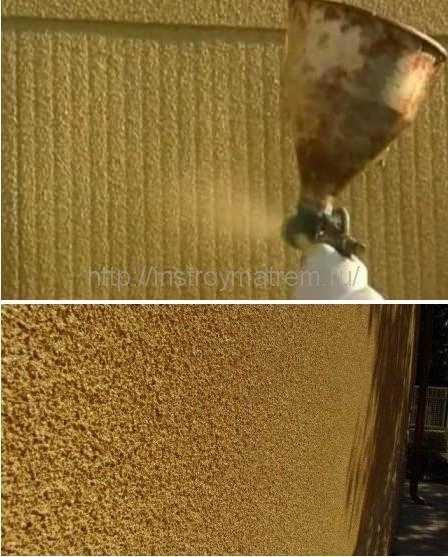 Сначала наносится базовый слой пробкового дерева толщиной 1,5 мм, после высыхания наносится закрепляющий слой, имеющий толщину 2,5 – 3 мм. Второй слой должен наносится через 4-6 часов. При высыхании смесь меняет свой оттенок и это позволяет увидеть места разнородного напыления раствора.