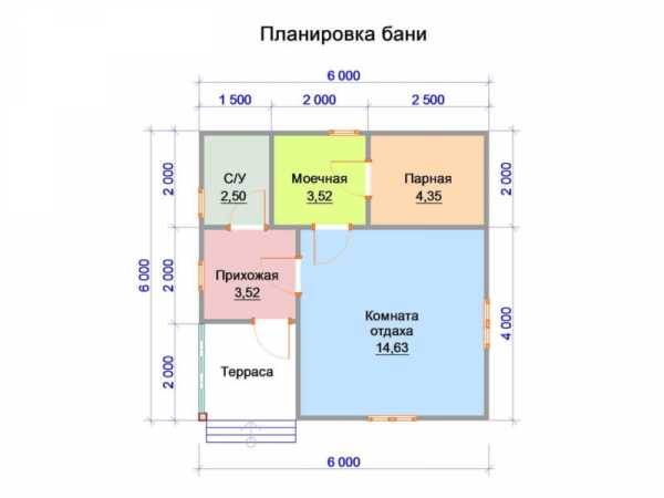 Дизайн бани 6×6 дает больше вариантов для фантазирования, нежели размерами 6×4. Но планировка у них схожая: