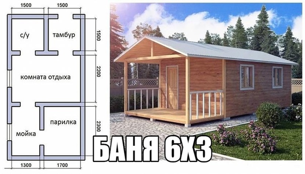 Постройка разбивается на три сектора, по 2 м каждый. Справа располагается парная, в центре – душевая, слева – комната отдыха. Душевая делится на две части, 1/3 ее площади отдается под тамбур. У входа в помещение возводится крыльцо с козырьком, защищающим от солнца и осадков. Есть и другие варианты: иногда баня 6 на 3 метра, выстраивается с верандой под одной крышей или объединяется с террасой.