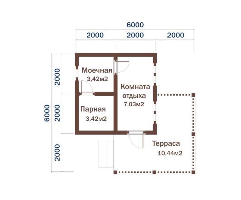 В качестве примера можно привести базовый проект бани 6×6 м с туалетом, однако каждый хозяин дачного участка вправе внести в его план собственные корректировки, исходя из индивидуальных предпочтений и имеющегося в распоряжении бюджета.