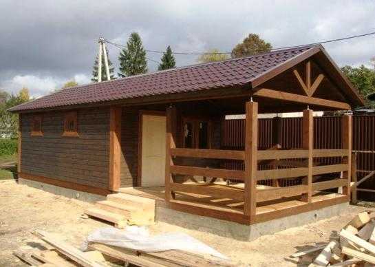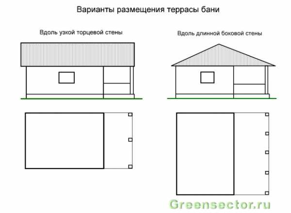 Вдоль узкой торцевой стены оптимально компонуется небольшая терраса. Если же вам хочется сделать более просторное помещение, то открытый навес лучше сделать вдоль широкой стороны бани.
