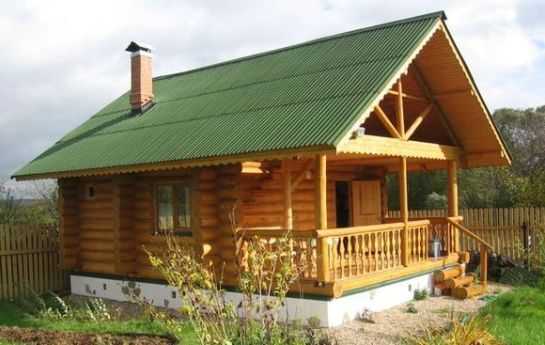 На фото №1 мы видим классическую баню из оцилиндрованного бревна, накрытую двускатной кровлей из металлочерепицы. Крыша прикрывает не только помещение бани, но также террасу и балкон второго этажа.