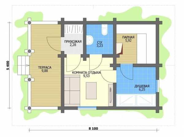 Обдумывая проект бани с террасой в части ее внутренней планировки, нужно исходить из внешних габаритов сооружения. Именно в эти рамки вам придется «вписать» все помещения: предбанник, санузел, душ, парилку комнату отдыха и террасу. Можно сэкономить полезную площадь, отказавшись от комнаты отдыха и переложить ее функции на веранду. Однако, в этом случае в холодное время года вам негде будет расслабиться после помывки в бане. Поэтому зарезервируйте для нее хотя бы 6-7 м2.