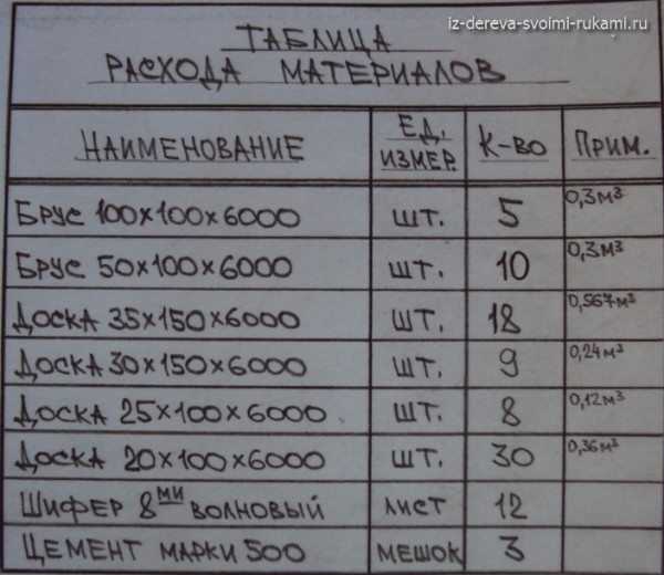 Приводим пример такого перечня, соответствующий приведённым примерам (указаны номера деталей на чертежах, все материалы имеют обработку, как механическую, так и антисептическую; если не указан вид материала, то это — доска):