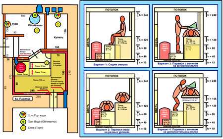После тамбура целесообразно расположить комнату отдыха с совмещенной функцией раздевалки. Тут же может располагаться топка печного оборудования, если это стандартная дровяная каменка. Её можно заменить газовым или электрическим отопительным оборудованием. Далее следует мойка и парильное отделение, куда выходит собственно парогенератор печи.