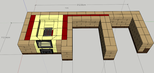 Шамотный кирпич ставится на бок (на тычок). Желтую на рисунках кладку будем изолировать от красной базальтовым картоном, приклеенным на термостойкую мастику. Он подклеивается к красным кирпичам, поэтому выкладываем сначала красные кирпичи порядовки, затем шамотные. Это связано с различными тепловыми свойствами данных материалов.