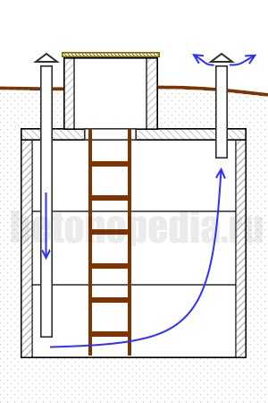 - Вытяжная труба размещается в наивысшей точке погреба под потолком.