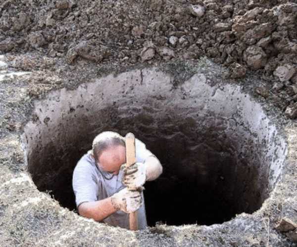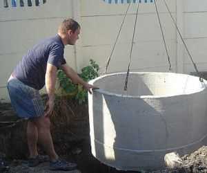 Первым делом копается яма необходимой глубины и диаметра. Нужно принимать во внимание, что диаметр ямы должен незначительно превышать диаметр бетонного кольца, потому что в нее требуется без приложения дополнительной силы уложить конструкционные элементы. Позже эти пустоты засыпаются грунтом вперемешку с камнем (обычно используются осколки кирпичей), что позволяет прочно зафиксировать кольца в земле. Конечно, можно воспользоваться и цементным раствором.