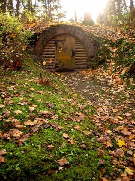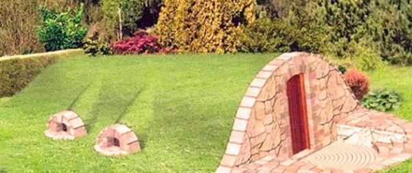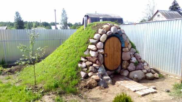 Погреб, сделанный из бетонных колец в горизонтальном положении, засыпают грунтом и оформляют растительностью против осыпания.